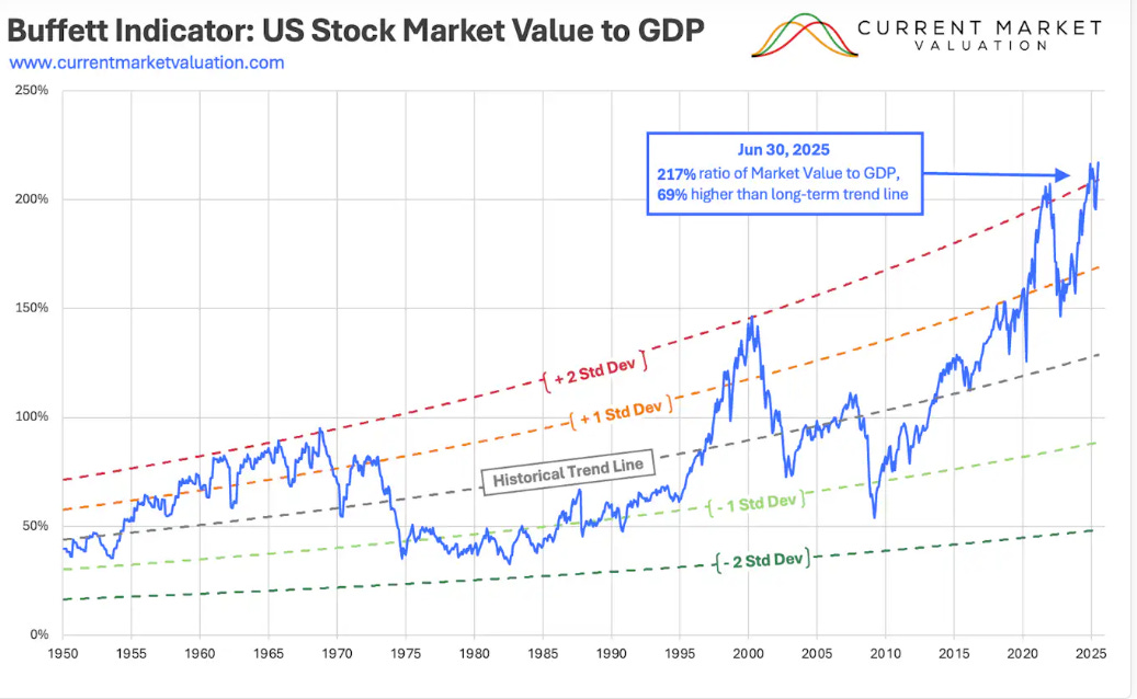 如果说马克斯的分析是诊断书,那么巴菲特指标就是那份令人不安的化验单。该指标计算非常直观:美国股市总市值(以威尔希尔5000指数为代表)除以美国GDP。其逻辑在于,长期来看,一个国家所有企业的总价值不应持续地、大幅地超越该国的经济产出。