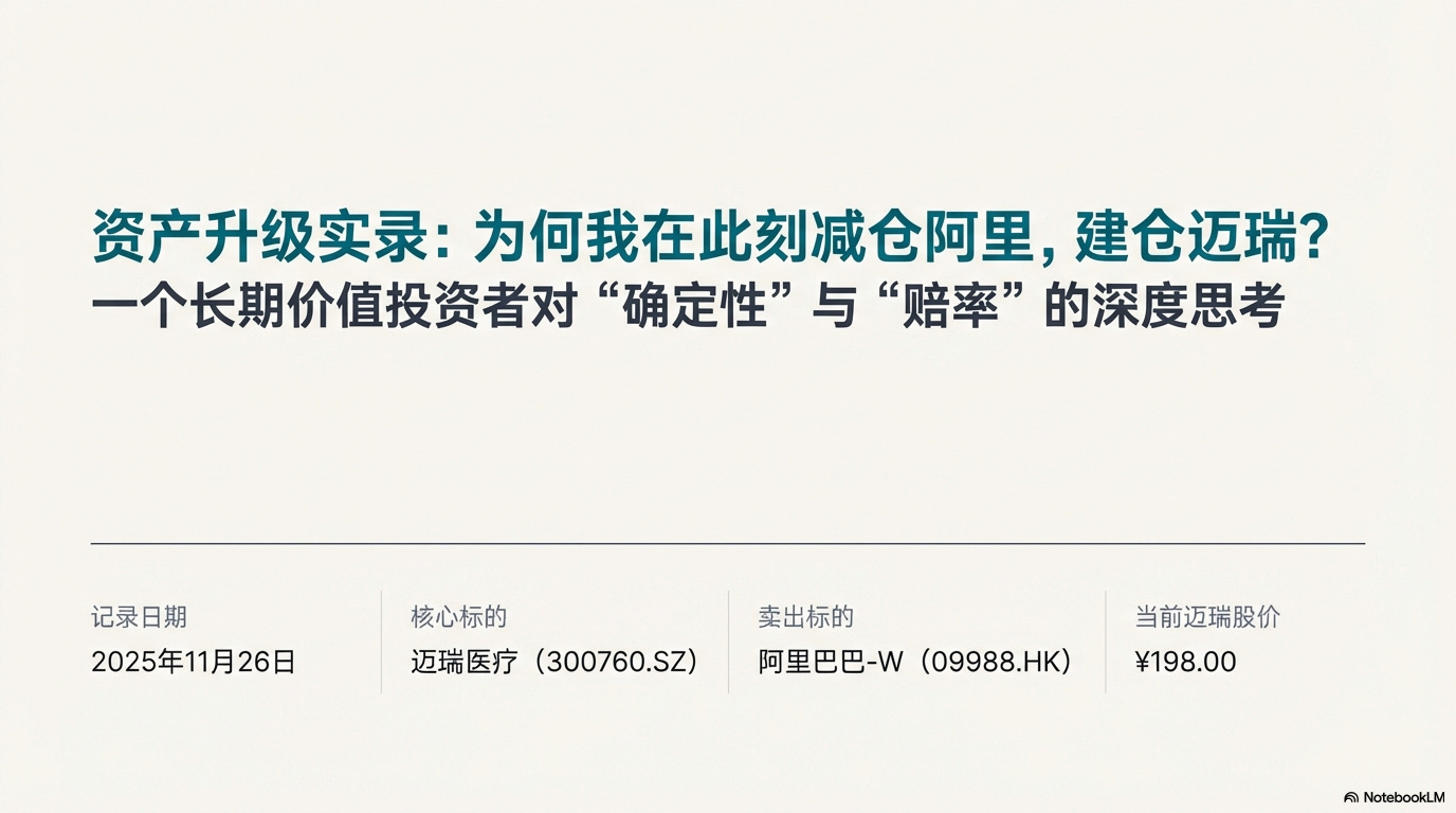当阿里的市盈率升至20倍,“低估值”红利已逝。我决定告别红海内卷,用微小的溢价,置换处于历史底部的“医疗航母”迈瑞。作为医生,我看懂了它的壁垒;作为投资者,我看懂了它的周期。本文详述这次资产升级的底层逻辑与双轨建仓方案,助你锁定未来十年的确定性复利。