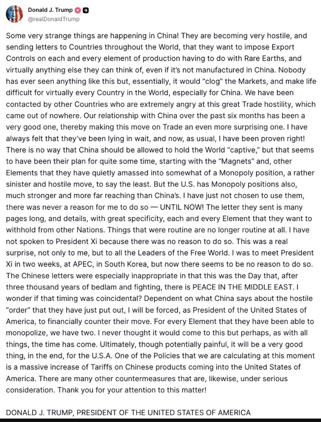 对稀土出口限制的报复: 这一威胁是对中国近期限制稀土矿物出口的直接回应——稀土是整个全球科技供应链(从消费电子产品到国防系统)的关键材料。 这标志着贸易摩擦从广泛的关税战升级为针对战略资源的精准对抗。