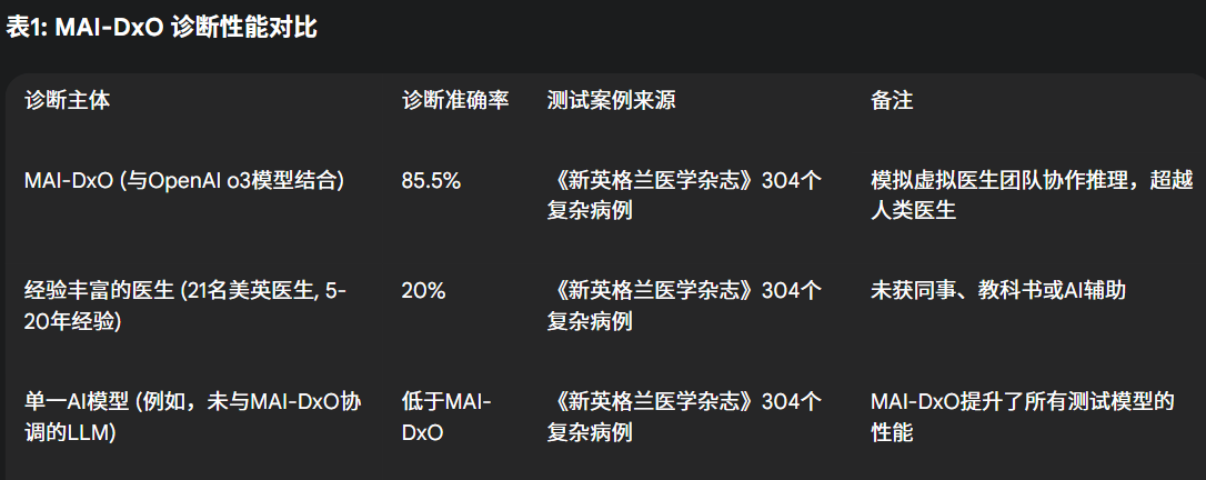 MAI-DxO在诊断能力上表现卓越。在《新英格兰医学杂志》(NEJM)的304个复杂病例测试中,该系统实现了超过85%的诊断准确率。当MAI-DxO与OpenAI的o3模型结合时,其准确率更是高达85.5% 。