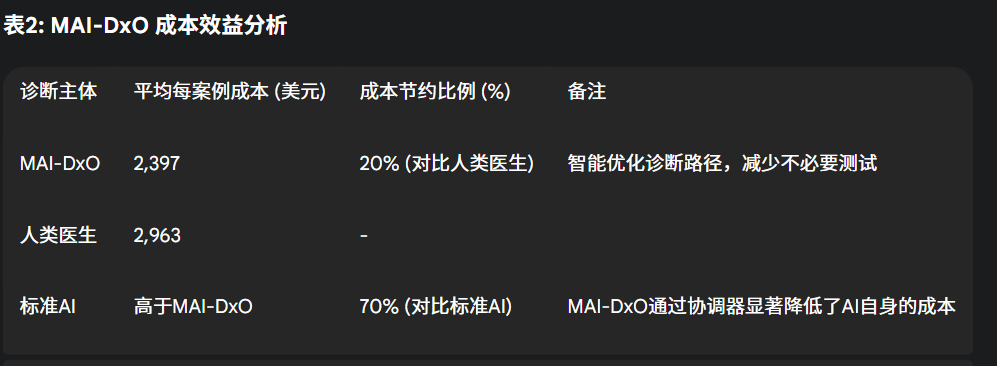 这一表现与人类医生形成鲜明对比:由21名来自美国和英国、拥有5-20年临床经验的执业医生组成的对照组,在相同案例上的平均诊断准确率仅为20% 。这意味着MAI-DxO的诊断准确率是人类医生的四倍以上,凸显了其在复杂诊断任务中的压倒性优势。