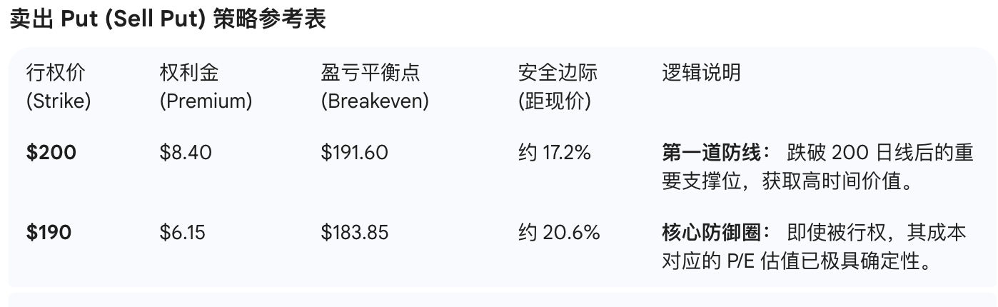 10% 正股(底仓): 现价(约 $231.44)直接建立初始仓位,对冲估值修复行情突然启动的踏空风险。