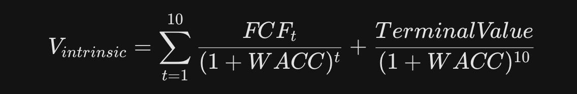 确信了 15% 的增长潜力,我们可以建立一个正向的 DCF 模型,推算 AMZN 的底盘价值。其估值核心公式如下: