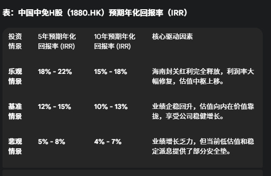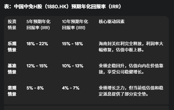 对长期投资者而言,核心问题是“以当前价格买入,未来能获得多少回报?”。我们通过内部收益率(IRR)模型,结合三种情景,对投资中国中免H股的5年和10年期年化回报率进行预测。该模型综合考虑了资本增值(股价向内在价值回归并随公司成长而增长)和每年的股息收益。