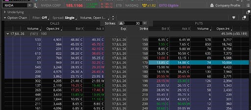 Open.Int(未平仓量)一列。不要看成交量,只看 OI。寻找目标: 找到那个数值像“鹤立鸡群”一样突出的行权价(例如 NVDA 的 $150, OI: 18,742)。这就是我们绝不轻易跨越的红线。