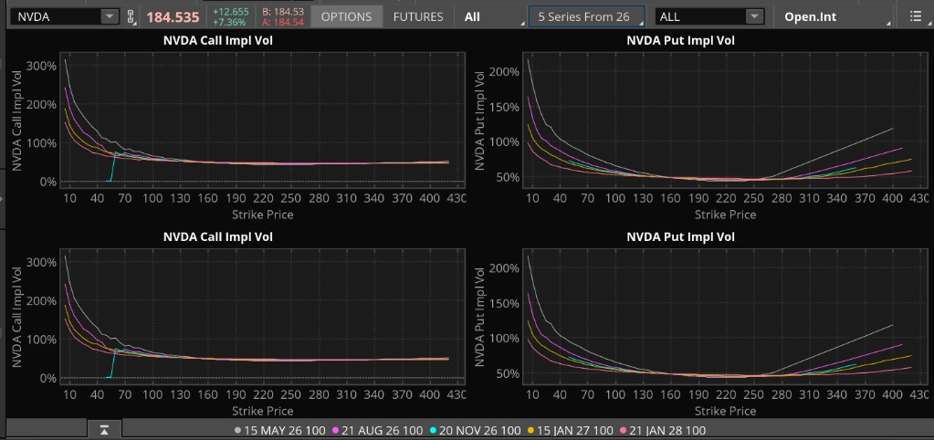 深度逻辑: 在风平浪静时,Put 和 Call 的隐含波动率(IV)差异不大。但在恐慌时,大家都在疯抢 Put 避险,导致 Put 端 IV 飙升,曲线形态会变得极度陡峭。
