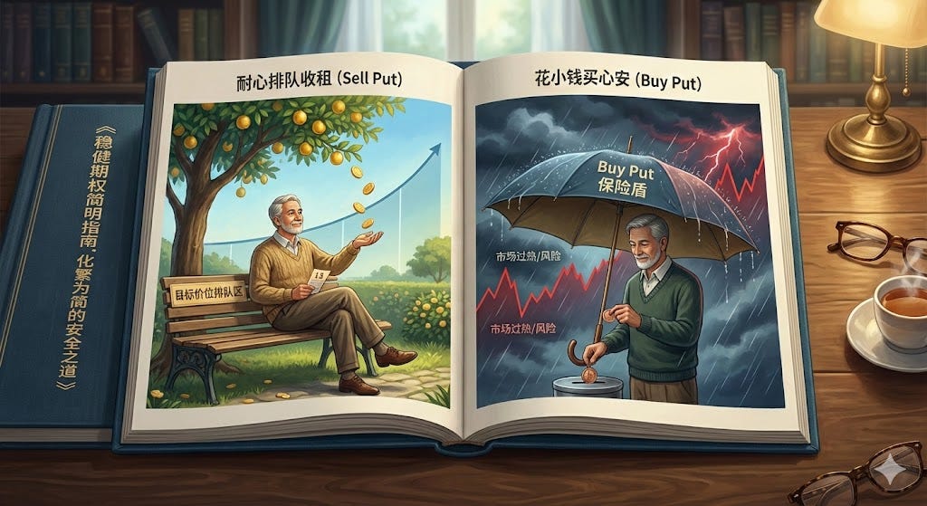 稳健投资不靠花哨技巧,而是靠在关键节点做对两件事:在想买却嫌贵时,用 **Sell Put** 一边排队一边收租;在市场情绪过热或风险逼近时,用 **Buy Put** 花小钱买心安。这份小册子把复杂期权化繁为简,让长期投资者用最少的动作,获得更高的安全边际与更稳定的收益。
