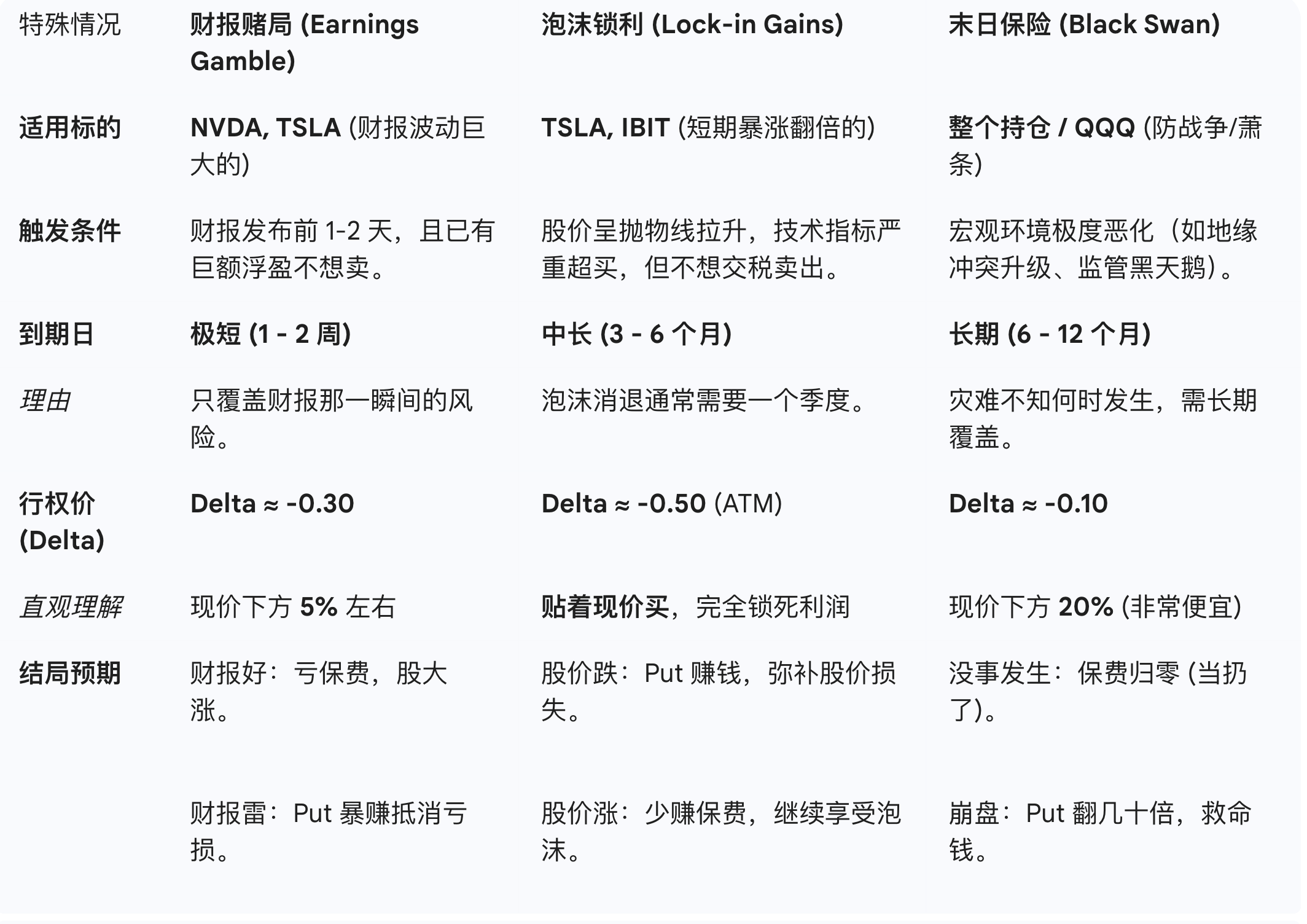 核心逻辑: 平时不用。只有在预感“前方有雷”或“泡沫要破”时,花小钱买个心安。