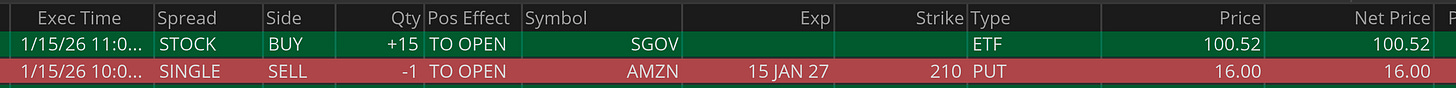 即时转化:AMZN 权利金到账后,第一时间买入 15 股 SGOV(成本约 $1,507)。