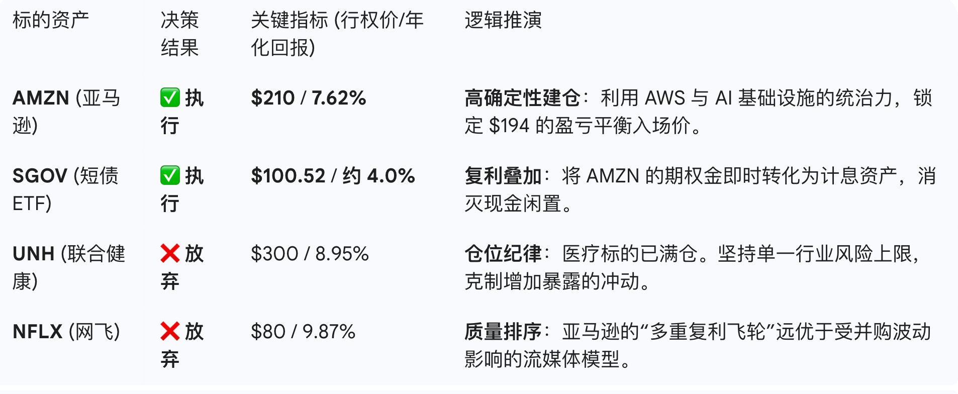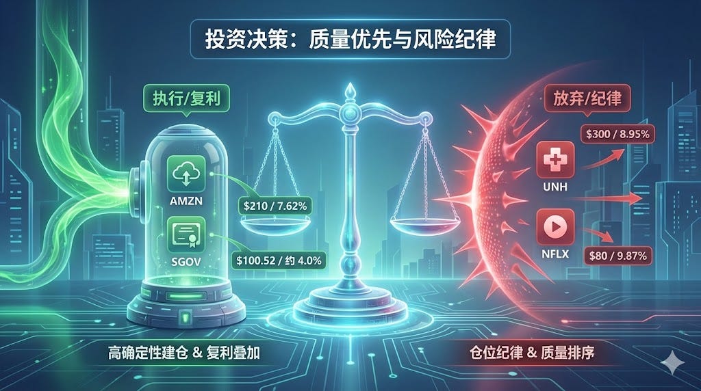 真正的投资高手不仅在于选对标的,更在于如何管理那些“正在等待标的”的资金。AMZN 的深度安全边际叠加 SGOV 的利息垫,构成了一个“输了也是赢”的完美博弈。时间,便成了我最好的朋友。