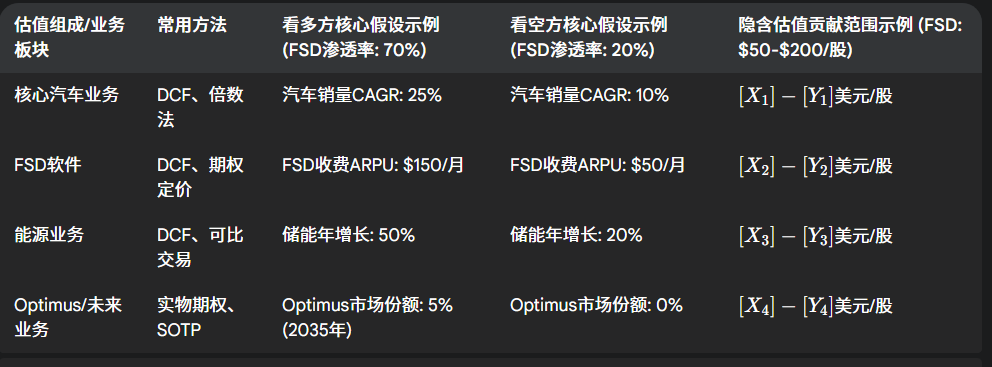 B. 主要估值方法: 分析师普遍采用现金流折现法(DCF),预测其汽车销售、储能业务以及日益重要的软件/全自动驾驶(FSD)等未来收益流。DCF模型对远期增长率和折现率假设高度敏感。**分类加总估值法(SOTP)**亦被频繁使用,分析师借此对特斯拉多元业务(电动汽车、能源、FSD/人工智能、保险等)分别估值。不同分析师对各板块的权重和增长预期差异较大。**可比公司分析法(基于市盈率等倍数)**也被应用,但因特斯拉独特定位(跨汽车、科技、能源行业),其适用性常存争议,参照高增长科技股或传统汽车制造商会产生迥异的估值结果。选择何种估值方法,往往已预示了分析师对特斯拉的乐观或悲观倾向:侧重SOTP并纳入机器人出租车或Optimus等高想象空间业务的分析师,倾向于给出更高估值;而严格聚焦汽车产销和短期盈利,采用保守DCF或传统汽车倍数的分析师,则估值偏低。