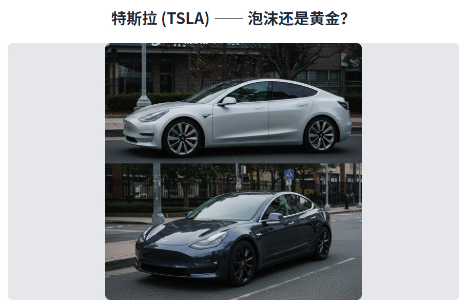 特斯拉 (TSLA) —— 泡沫还是黄金?解码万亿巨头的真实价值 特斯拉,一个让华尔街疯狂、让世界瞩目的名字。它的股价如火箭般蹿升,又如过山车般起伏。这究竟是一家被无限高估的泡沫公司,还是一个正在重塑未来的黄金标的?