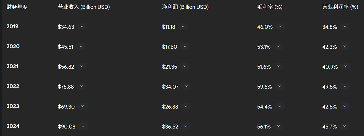 2025年第一季度(实际):营收255.3亿美元,毛利率58.8%,营业利润率48.5% 。